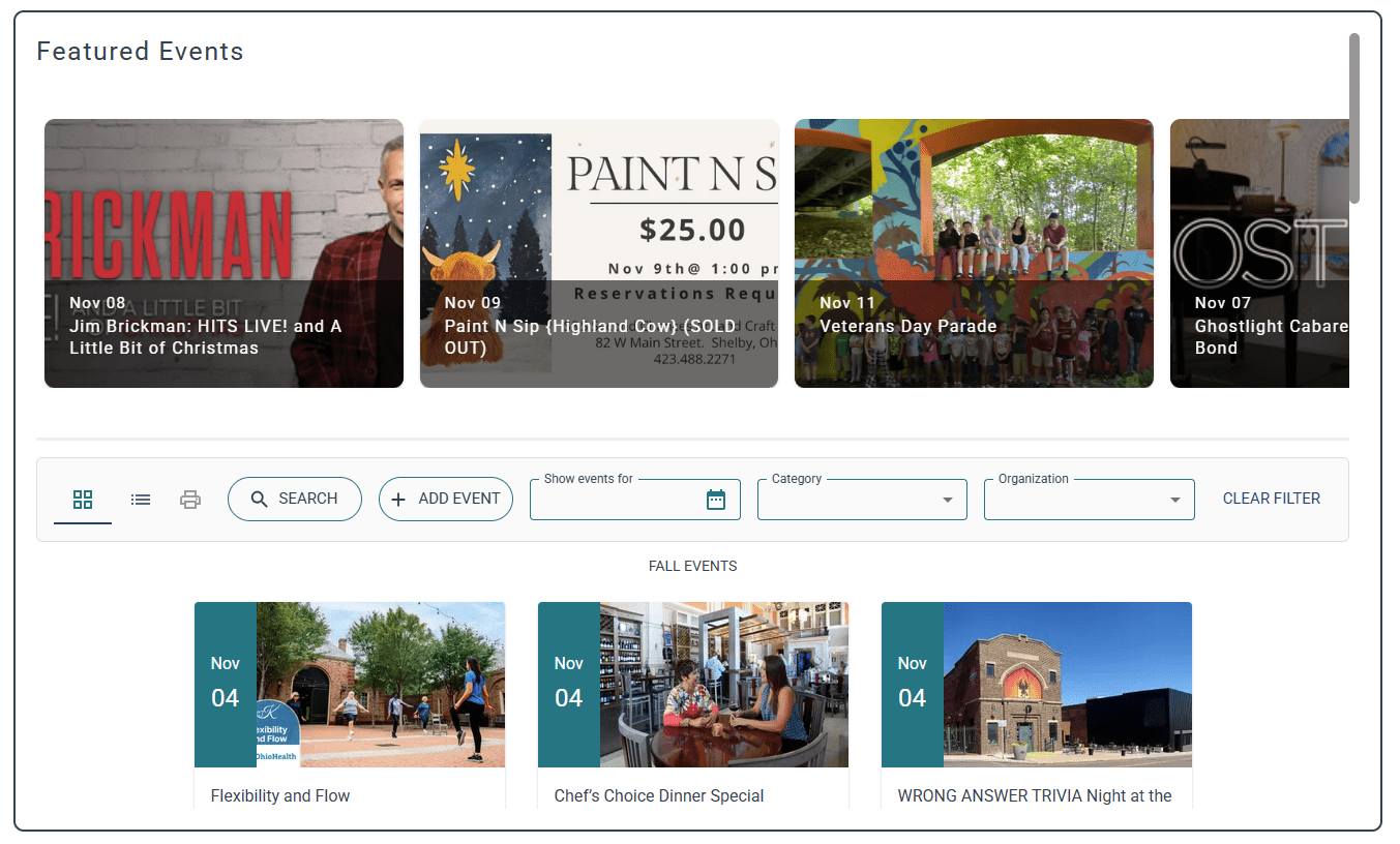 Enter BrandRichland.com/Events. This countywide central calendar was conceptualized in the 2019 Mansfield Rising plan and built through the BrandRichland initiative to make discovering local events simple, accurate, and fast. It’s powered by Yodel, an AI-assisted system that gathers and standardizes event information from trusted community sources, so you don’t have to chase it.